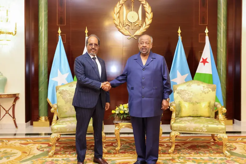 Madaxweynaha Soomaaliya Mudane Xasan Sheekh Maxamuud ayaa magaalada Jabuuti kula kulmay Madaxweynaha Jabuuti Mudane Ismaaciil Cumar Geelle.